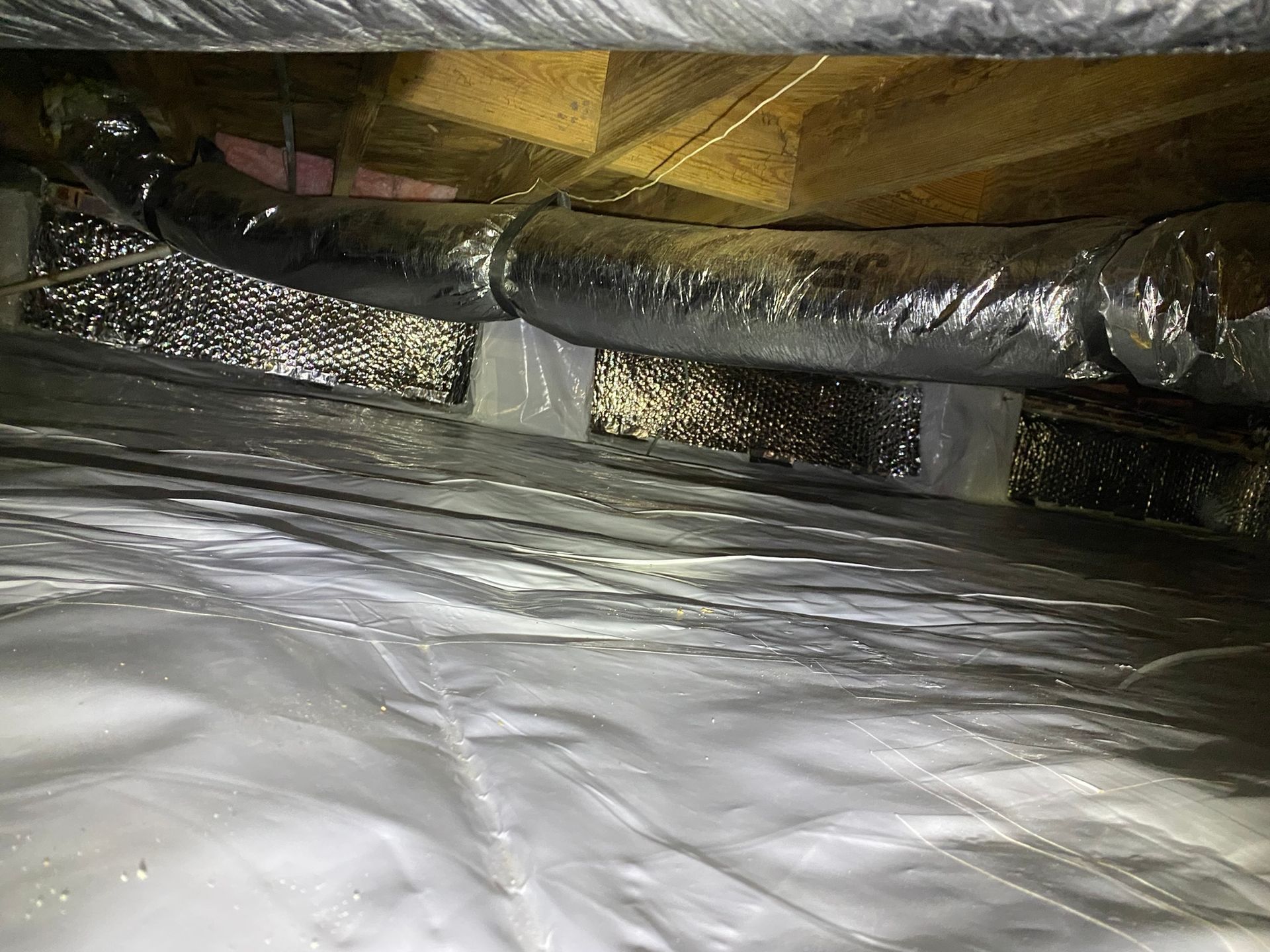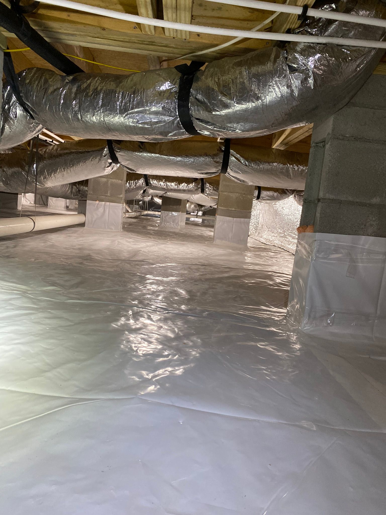 This is a crawl space that has a diffuser that gives it the same heat and air conditioning as your house. The crawlspace is tightly sealed by all exterior foundation vents, water pipes, wiring, to give it the perfect seal.. The foundation walls are insulated with a R-10 insulation that is waterproof. To complete the moisture control we install a 10 mil white liner. This meets all North Carolina Code Requirements.